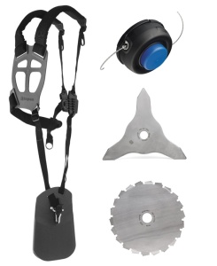 Husqvarna 336FR levereras med: Balance 35 sele, Trimmerhuvud T35, gräskniv Multi 300-3T-1" och röjklinga Scarlett 200-22-1"